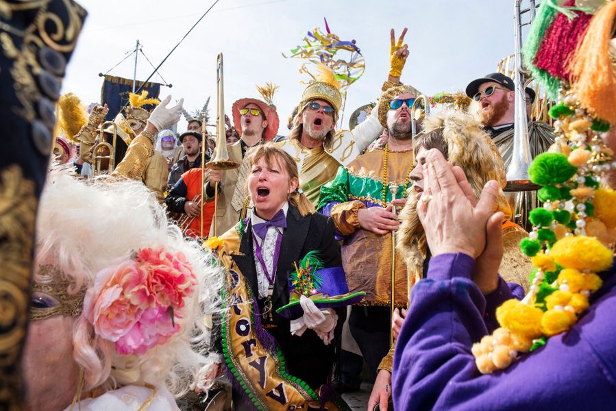 Dressed as phoenixes for Mardi Gras 2022, the Society of Sainte Anne parades down Chartres Street towards Jackson Square on their way to the river. Sainte Anne was founded in 1969 by a group of friends keen to revive the gorgeous, glorious street masking traditions of Mardi Gras past. They remain, as one longtime member puts it, “a very anachronistic, anarchic group with no membership roster, no dues. We are an organic occurrence with a band — once a Secret Society and now the favorite to see on Mardi Gras morning — a group of friends and neighbors dressed in their finest regalia, going for a long walk together.”