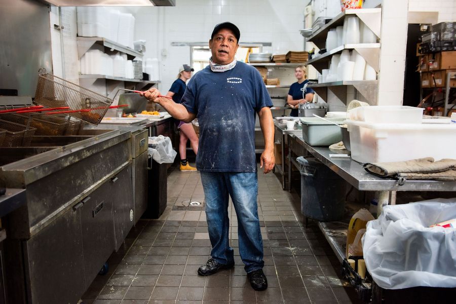“I was a candy maker by Leah’s Praline Shop. I did that for about 25 years, then I left making candy and I went to cook at Kenny’s Seafood. I worked so hard, and it took a toll, so I said, while I got my spirit and my health, let me retire. So I can keep doing what I’m doing. Hopefully somewhere down the line, God will bless me that with all the years I put in, I get something back. My son Jeremy is second in line, and my goal with Monogram Hunters is to keep it going. But I think I’m gonna do a couple of more years and I really want to retire. Like most chiefs, I want to be able to come out and put a t-shirt on and a pair of jeans on carnival and say, ‘Look what I’ve done that’s still here.’ From another view than putting a suit on. So my blood is still here, and I’m able to see that I did this. That’s what I want.” Monogram Hunters Big Chief Tyrone “Pie” Stevenson works a double shift at Kenny’s Seafood as head cook in May 2021. Pie would work four double shifts a week, then go home and work on his suit.