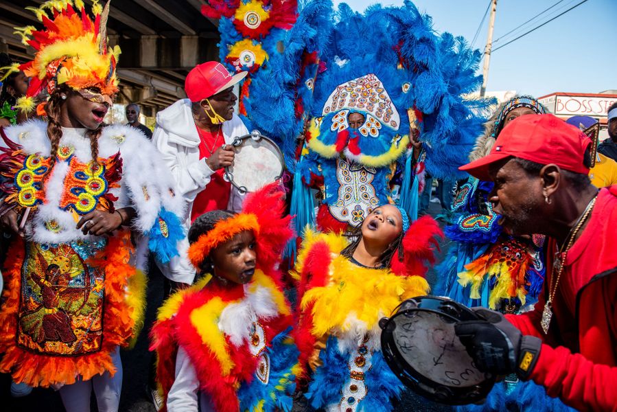 Big Chief Kevin Goodman comes out with his tribe, the Flaming Arrows, on Mardi Gras day 2022. He is in the blue suit, center back, with Big Queen Mecca, left, Bruce Merritt on tambourine on the left, Lil Queen Kay Kay, Lil Queen China singing, and Baka La on tambourine on the right. Big Chief Kevin first masked as a Lil Chief in a stroller in 1960. He grew up in a family deeply immersed in Black Masking culture and is committed to passing it down from generation to generation.