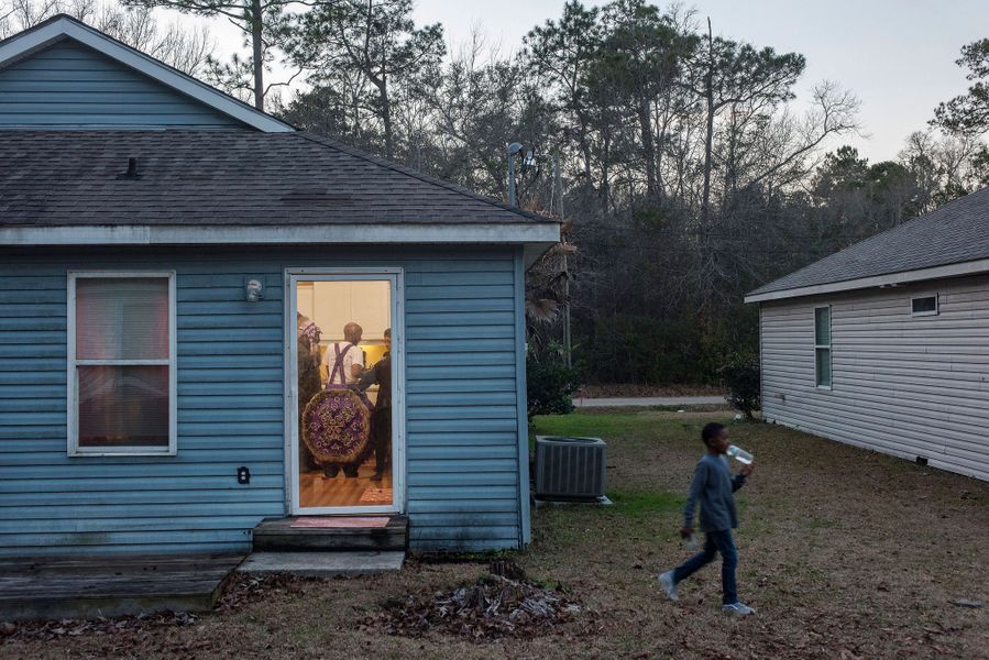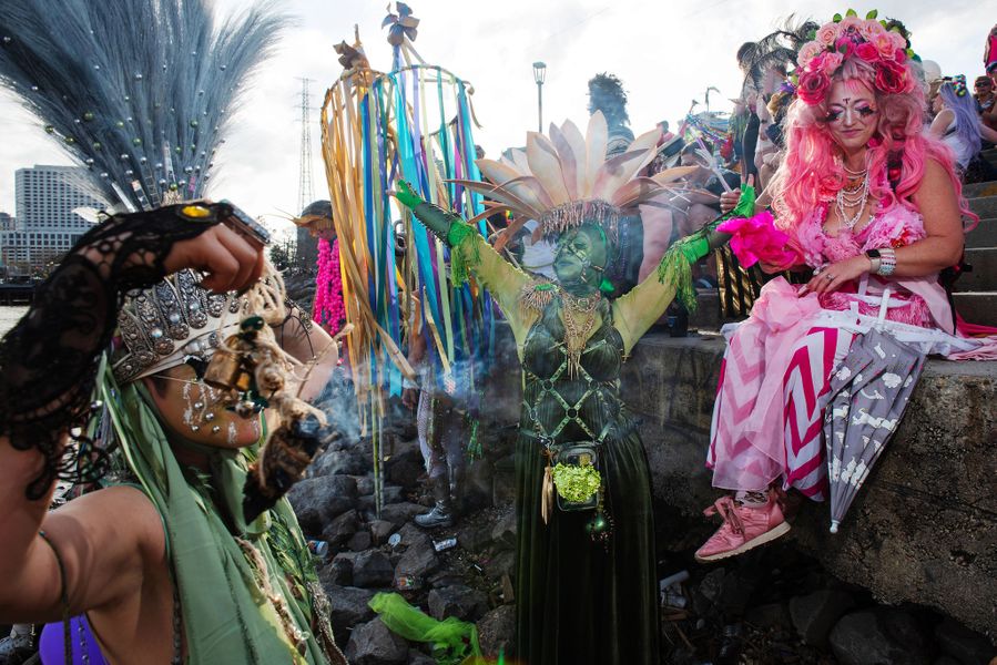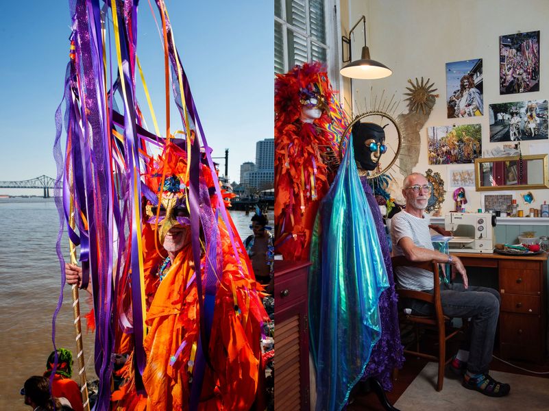 “My friends and I started the krewe five or six years ago, in the tradition of having a neighborhood walking parade that is family friendly. Every year, we crown all the newborn children as the Kings and Queens of Krewe de Cape. The wonderful thing is that there’s a low barrier to entry; essentially, it’s just showing up and wearing a cape, which is very loosely defined, from a bed-sheet all the way up to a really ornamental piece of artwork that people spend a lot of time, energy, and effort creating. There are folks that do capes that are puns, like a moonscape or a beachscape. There are people making capes that are fabric forward, something that’s velvety and luscious, or sparkly and reflective. There are folks that have it as a part of a bigger outfit, or else they’re very plain and the cape is the part that shines. Considering the long and deep and meaningful history of carnival in New Orleans, to have our little community parade be featured alongside groups like the Mardi Gras Indians, with their spiritual and reverent traditions, is really an honor.” Vann Joines parades in the Bywater neighborhood with Krewe de Cape, sometimes said to stand for “contemporary architecture, pastries, etcetera,” two Saturdays before Mardi Gras, 2022.