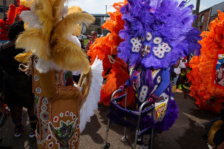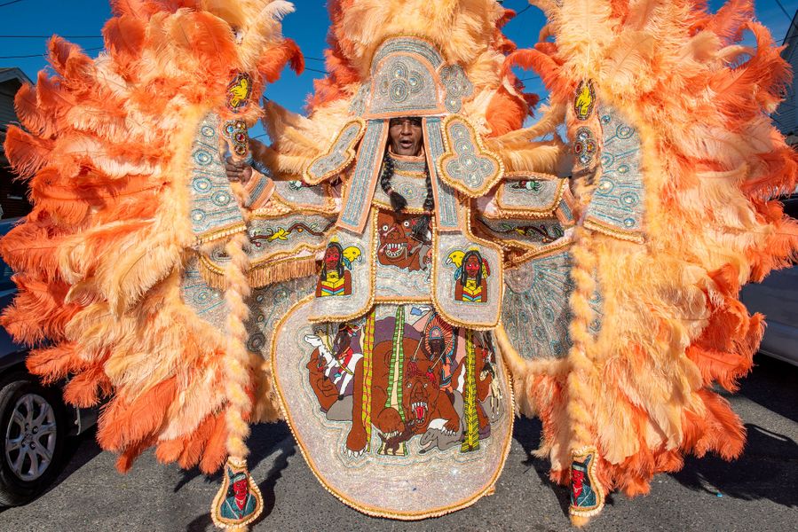 “That photo brings back fond memories of me being very excited to see how beautiful my tribe turned out that particular year. Every year coming out on Mardi Gras, it’s still having those same butterflies, still being excited to show off my artwork to all the people that have come out to see it, and being really excited and interested in seeing how everybody else looks outside of my tribe. What we do Is based on culture, but it has a lot of competition in it as well. Me being in it for as long as I have, I think I’ve become a big fan of seeing other people’s work, not only showcasing my own. It’s an honor to continue to pay homage to all of the ones that came before me. Now a lot of those guys have stopped masking and they come out to see me. Just to see the looks on their faces when I come out on Mardi Gras and they get a chance to see the suit for the very first time — it’s honoring, and also humbling. What keeps me doing it? Being called by those drums and those tambourines. It’s hard to put in words, but that calling is almost spiritual.” Big Chief Alphonse “Dowee” Robair with Big Queen Edwina Waterhouse of the 9th Ward Black Hatchet tribe out in their neighborhood on Mardi Gras day, 2019.