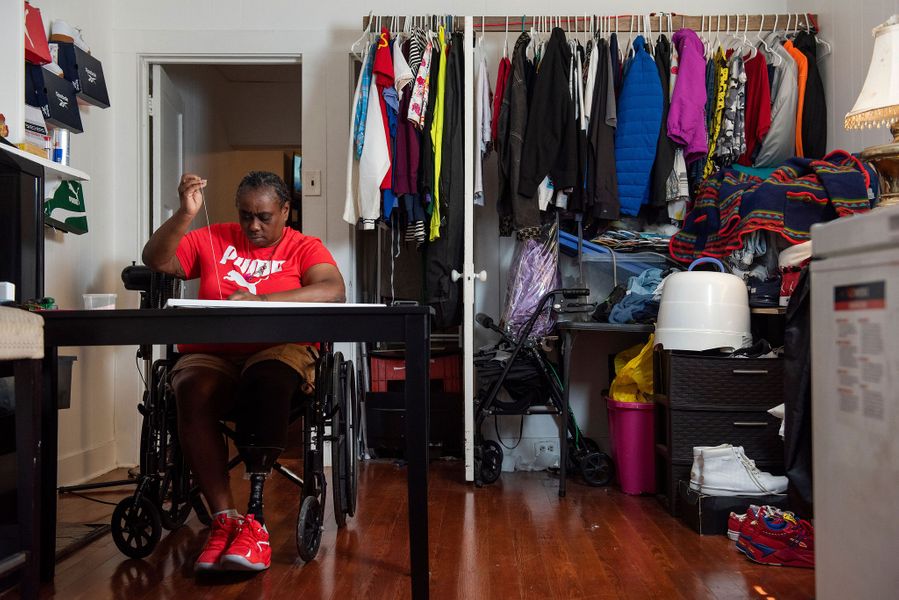 Kayla Goforth of the Krewe of Red Beans works on her suit in February 2020. Inspired by New Orleans’ parading traditions, as well as its signature dish, the Krewe of Red Beans make costumes decorated with red beans, rice, and other legumes, and parades on Lundi Gras, the day before Mardi Gras.