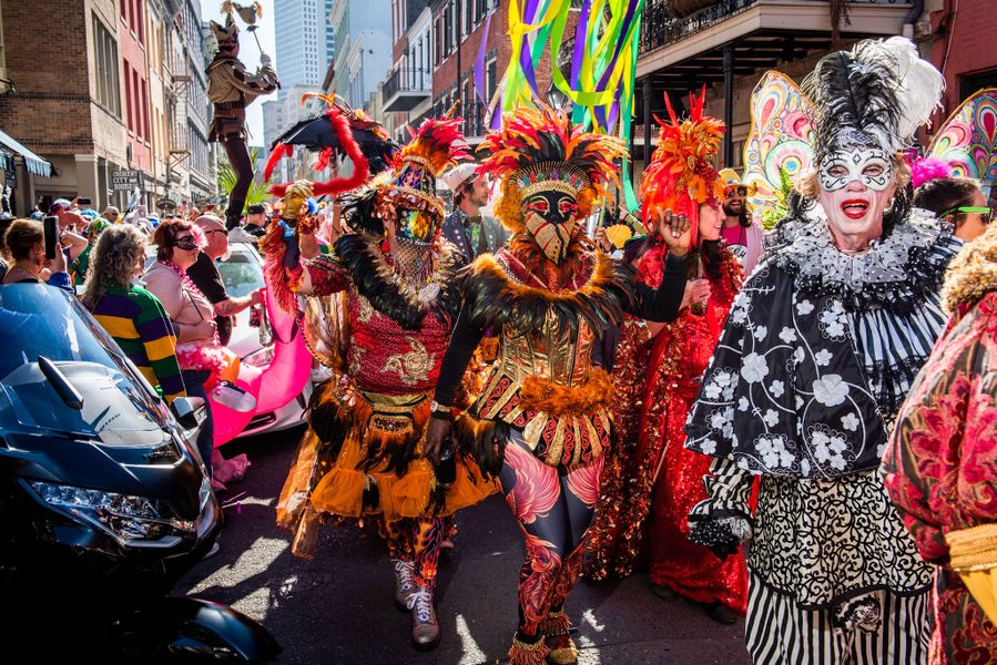The Society of Sainte Anne crosses Decatur Street on their way to the river on Mardi Gras day, 2023. From its very beginnings in 1969, the Secret Society’s founders set the tone for an elegant, opulent, dramatic, glamorous, glittering aesthetic that persists to this day.