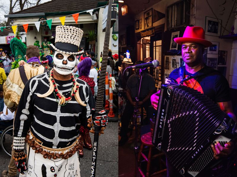 “I’ve played in this bar for 23 years and I’ve masked with the Northside Skull and Bone Gang for 24 years. These have been constants in my life as a musician. For me there’s no separation between those worlds. I would call it community service. It’s medicinal for people in New Orleans to have music in their lives. For people who can’t afford to go to the doctor and lie down and tell them their problems, music is a remedy. Masking with the Northside Skull and Bone Gang is that too. It’s saying, You Next! You can’t buy your way into happiness, you have to generate it from the ground up. You have to make the right choices. It’s the old African narrative: masking as skeletons to show people and remind them where they are headed. Carnival day was the only opportunity that enslaved Africans, especially men, had to express themselves — while having some fun and merriment, but the main thing is to honor the ancestors and bring those messages.” Bruce Sunpie Barnes, Big Chief of the Northside Skull and Bone Gang, on Mardi Gras day 2020. Sunpie and the Louisiana Sunspots play their regular Saturday night gig of Afro-Louisianan music at Dos Jefes, 2023.